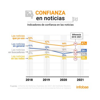 El Informe también reportó cuatro indicadores de confianza en las noticias: las noticias en general; las que las encuestadas y los encuestados consumen en los medios; las que consumen a través de los buscadores; y las que encuentran en las redes. Estos dos primeros indicadores registran un leve repunte de 3 puntos porcentuales en cada caso respecto de 2020. Es posible que esta tendencia esté relacionada con la pandemia: en un contexto de incertidumbre informativa las audiencias parecen confiar más en las noticias provistas por los medios.