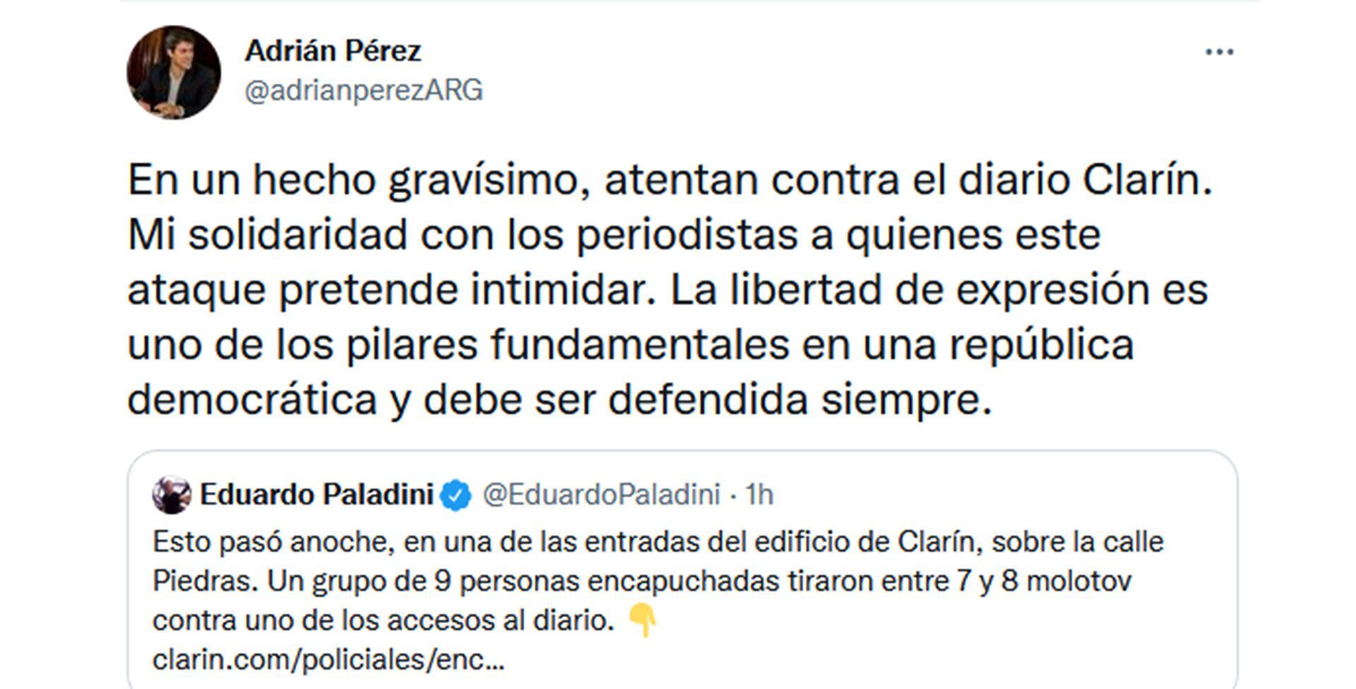 El dirigente de Cambiemos Adrián Pérez, en tanto, brindó su solidaridad hacia los periodistas, “a quienes este ataque pretende intimidar”. Y recordó que “la libertad de expresión es uno de los pilares fundamentales en una República democrática y debe ser defendida siempre”..