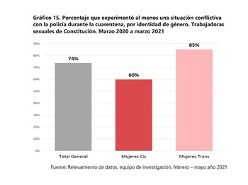 Se destaca, entonces, que a más de la mitad de las encuestadas se les pidieron documentos en la vía pública o las requisaron; y a un tercio las hostigaron, les labraron actas por ofrecer servicios sexuales, no respetaron su identidad de género o las insultaron. También refieren haber sido detenidas en comisarías; que la policía no actuara ante un pedido de ayuda, auxilio o denuncia que hicieron; y haber sufrido violencia física. El porcentaje de quienes padecieron al menos una de estas situaciones es del 60% entre las mujeres cis ─aquellas cuya identidad de género coincide con el sexo asignado al nacer─, pero asciende al 85% entre las mujeres trans.