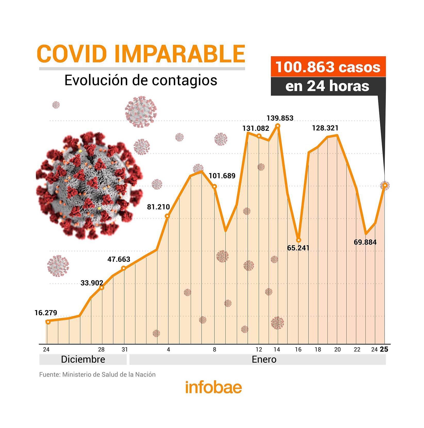 El Ministerio de Salud de la Nación informó este martes 25 de enero que, en las últimas 24 horas, se registraron 260 muertes y 100.863 nuevos contagios de coronavirus. Con estos datos, el total de casos desde el comienzo de la pandemia superó la barrera de los ocho millones y alcanza los 8.041.520. Los fallecimientos, en tanto, suman 119.703.
