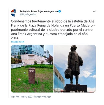 Pero no es la primera vez que ocurre un hecho de estas características con un monumento neerlandés en Puerto Madero. En 2019 fue robada la estatua de la princesa Beatriz de Holanda, situado en aquel momento a 20 metros del tributo a Ana Frank. “Estamos muy tristes por la desaparicion de la estatua ‘La nena feliz’ de la Plaza Reina de Holanda, al lado de nuestra Embajada. Fue nuestra donacion en 2004 para la inauguracion de la Plaza. Esperamos que las autoridades puedan resolverlo pronto”, tuitearon las autoridades diplomáticas neerlandesas en aquel momento.