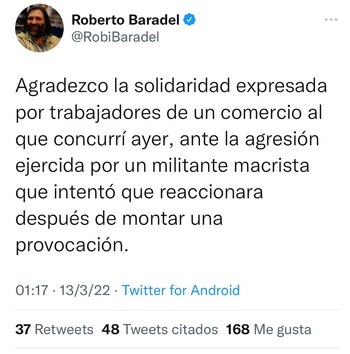 “Agradezco la solidaridad expresada por trabajadores de un comercio al que concurrí ayer, ante la agresión ejercida por un militante macrista que intentó que reaccionara después de montar una provocación”, escribió el sindicalista.
