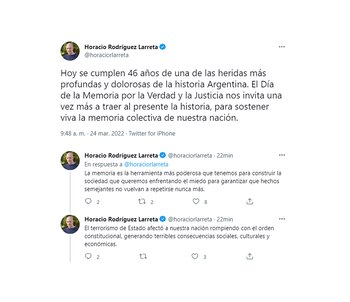 9:48 Hilo en Twitter de Horacio Rodríguez Larreta. Desde Europa, donde cumple una gira por varios países, el jefe de Gobierno de la Ciudad escribió una serie de mensajes por el Día de la Memoria. El dirigente macrista recordó las consecuencias sociales y económicas que dejó el Golpe Militar y pidió mantener “la memoria activa” para no repetir lo ocurrido en 1976. Además reivindicó “la libertad y el diálogo” y homenajeó a las víctimas del terrorismo de Estado. “El deseo de esa Argentina de diálogo, que debemos construir entre todos, debe ser el motor que una en un grito claro y contundente: dictaduras nunca más, democracias para siempre”, dijo.
