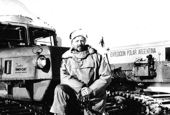 En estos días de conmemoración de los 40 años de la guerra de Malvinas vale su testimonio cuando regresaba de la expedición al Polo Sur navegando en el rompehielos General San Martín, el primero de la Armada Argentina, hacia Buenos Aires. A las cinco de la mañana golpearon la puerta de su camarote. El comandante de la Fuerza Antártida lo llamó con urgencia para que se presente en el puente de mando. Con prismáticos vio aproximadamente a seis millas de distancia dos puntos borrosos. “¡Que rara emoción, pocas veces sentida, estrujó mi corazón a la vista de esas tierras tan nuestras y tan extrañas! Contorneamos Isla Soledad y nos acercamos tanto a Puerto Argentino que podíamos ver sus casitas puntadas de rojo. Estoy seguro de que los habitantes no deben haber registrado nuestra presencia a tan temprana hora. Después corregimos lentamente nuestro derrotero y continuamos nuestro camino”, escribió.