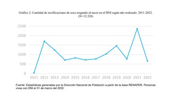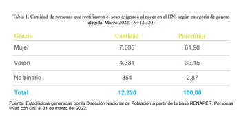 Mientras que desde la sanción del decreto N°476/21 —dispone la adecuación de los documentos de identidad y los pasaportes de viaje—, entre el 21 de julio de 2021 hasta el 31 de marzo de 2022, se realizaron 354 rectificaciones en el DNI con género no binario, nomenclatura “X”, el 2,87% del total.