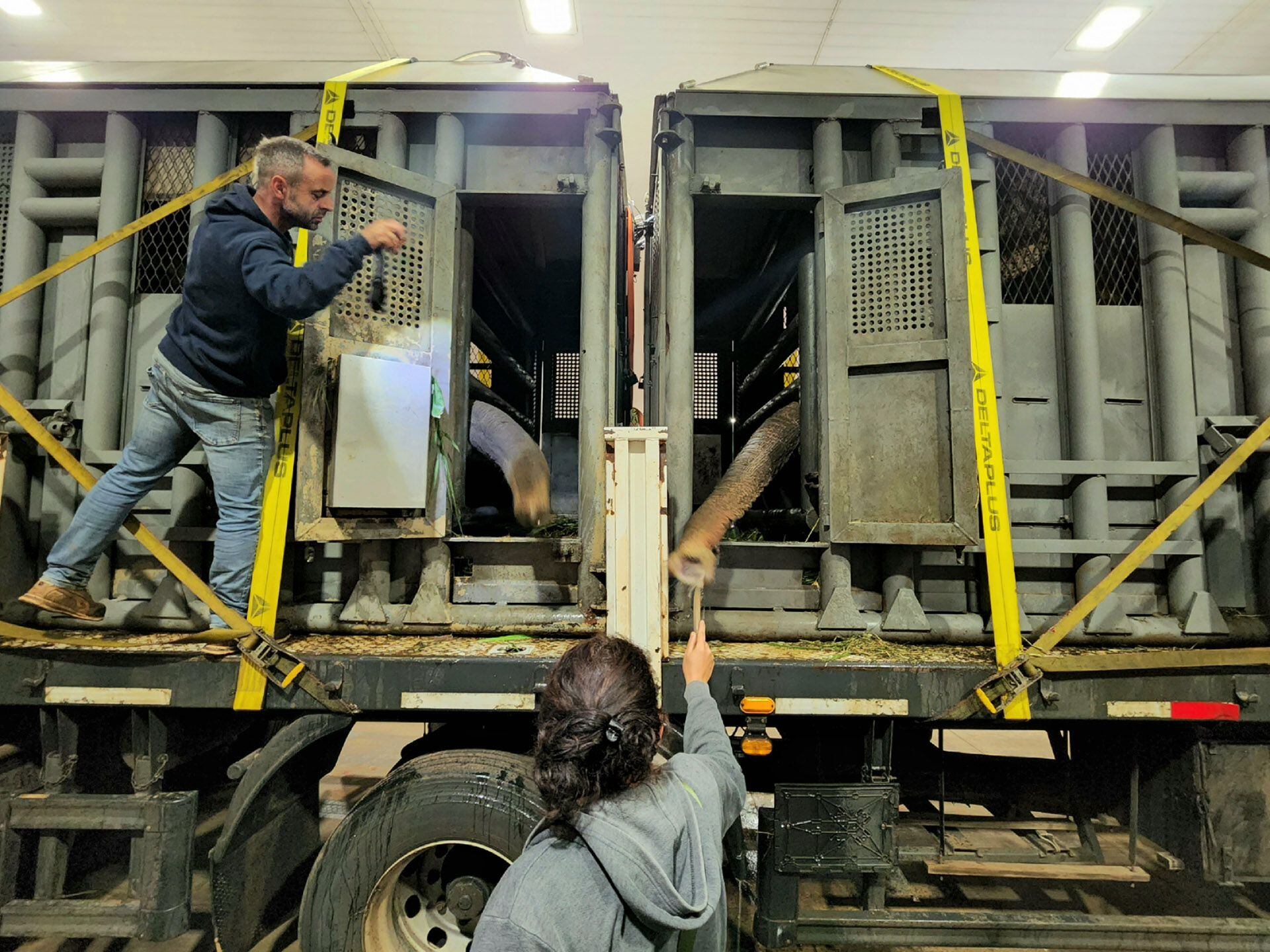 Junto a ellas viajan los cuidadores que Pocha y Guillermina tuvieron en el Ecoparque de Mendoza; el presidente del SEB, Scott Blais, el entrenador y una veterinaria. Leandro Fruitos, a cargo del operativo por parte de Fundación Franz Weber y de la Dirección Ecoparque Mendoza.