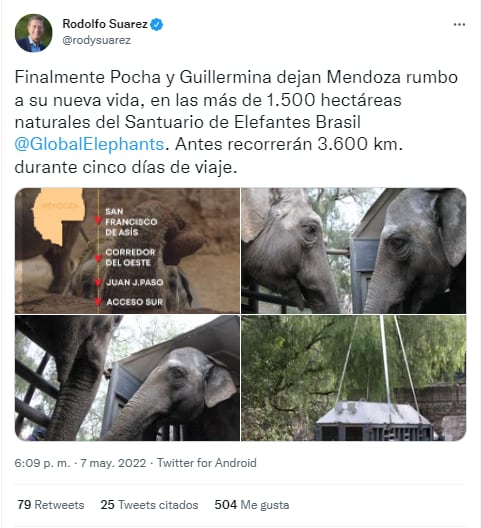 El momento de la salida de las elefantas fue seguida en vivo por miles de personas que se conectaron a las trasmisiones del SEB, de Proyecto ELE -Estrategias para la Liberación de Elefantes, la campaña de la Fundación Franz Weber- y que hasta lo compartió el gobernador en su cuenta de Twitter.