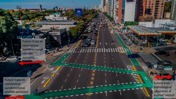 Asimismo, desde la dependencia oficial explicaron que “cruzando Libertador la traza comprendida en Rivadavia entre Libertador y Cantilo los ciclistas compartirán la calzada con la circulación general. Por tal motivo es que el cruce verde de Libertador presenta una bifurcación, del lado izquierdo (en forma de V) las bicis circularán por la avenida, mientras que en el sector derecho circularán en una traza unidireccional adyacente al bulevar central. Cada cruce verde tiene un único sentido de circulación el cual está señalizado con flechas sobre el mismo”.
