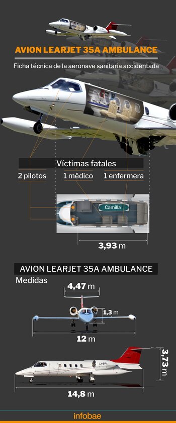 En este caso, la aeronave de la empresa Flying Argentina era parte de la división Fliyng Med dedicada a vuelos sanitarios; un Lear 35A LV-BPA con dos pilotos, un médico y un enfermero.