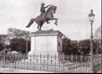 La antigua plaza del Retiro estaba adornada con banderas patrias y de todas las Naciones (…) La estatua estaba cubierta con un velo azul y blanco: un viento fuerte y frio que venia desde las Cordilleras lejanas, quería a cada momento desgarrarle, como para satisfacer la impaciencia que manifestaba el pueblo para contemplar la figura del héroe…” .