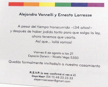 Dice Alejandro que con Ernesto al principio creyeron que el matrimonio no iba a cambiar nada. Pero, sí. Pasó de todo. “Recibimos muchos regalos. Hicimos una fiesta alucinante para 600 personas. A nivel sexual, hubo un reverdecer. Nos dio mucho orgullo haber podido ayudar a concretar una ley muy grande. Hice videos con famosos apoyando el matrimonio igualitario. Organicé un festival. Nos dio más pila para la vida”, concluye.