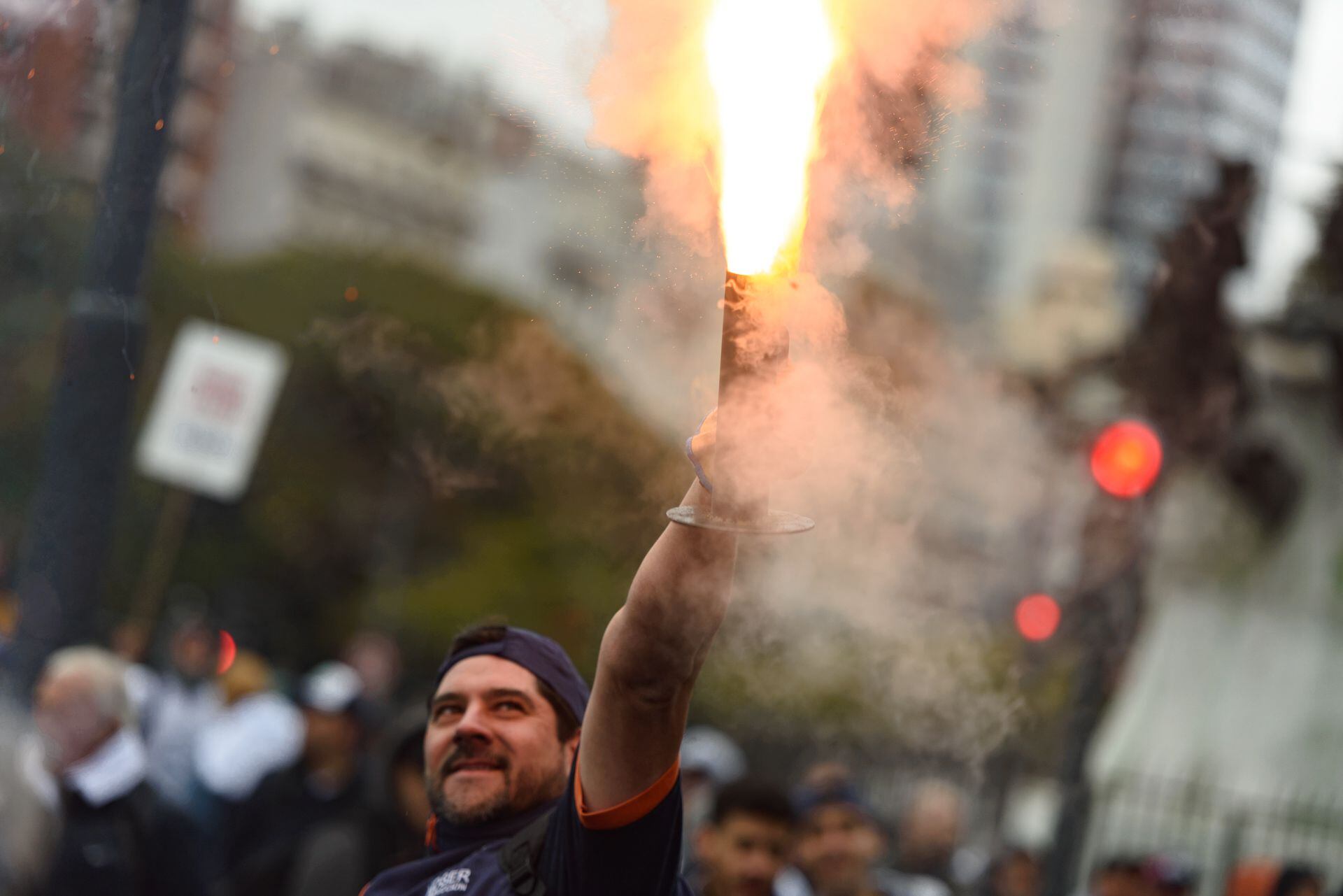 Los morteros y las bombas de estruendo resuenan en medio del sonido de bombos, redoblantes y la arenga de los manifestantes. En la intersección de Avenida de Mayo y 9 de Julio, un grupo de manifestantes del gremio de Luz y Fuerza hace detonar todo tipo de pirotecnia.