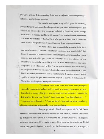 En el escrito denuncia haber sido víctima de maltrato verbal y laboral por parte del fiscal relator. Es el corolario de un cúmulo de eventos semejantes, según la visión que expone en su presentación: “No es la primera vez que sufro este tipo de descalificaciones verbales por parte de Del Cerro, fueron reiteradas situaciones a lo largo de mi carrera administrativa dentro de la institución”. El texto pone de manifiesto su sensación de indefensión, sus padecimientos preexistentes y procura informar los hechos relatados a efectos del mero conocimiento de la cúpula del organismo: no exige sanciones y somete a decisión de los miembros del tribunal su renuncia al cargo de fiscal subrogante.