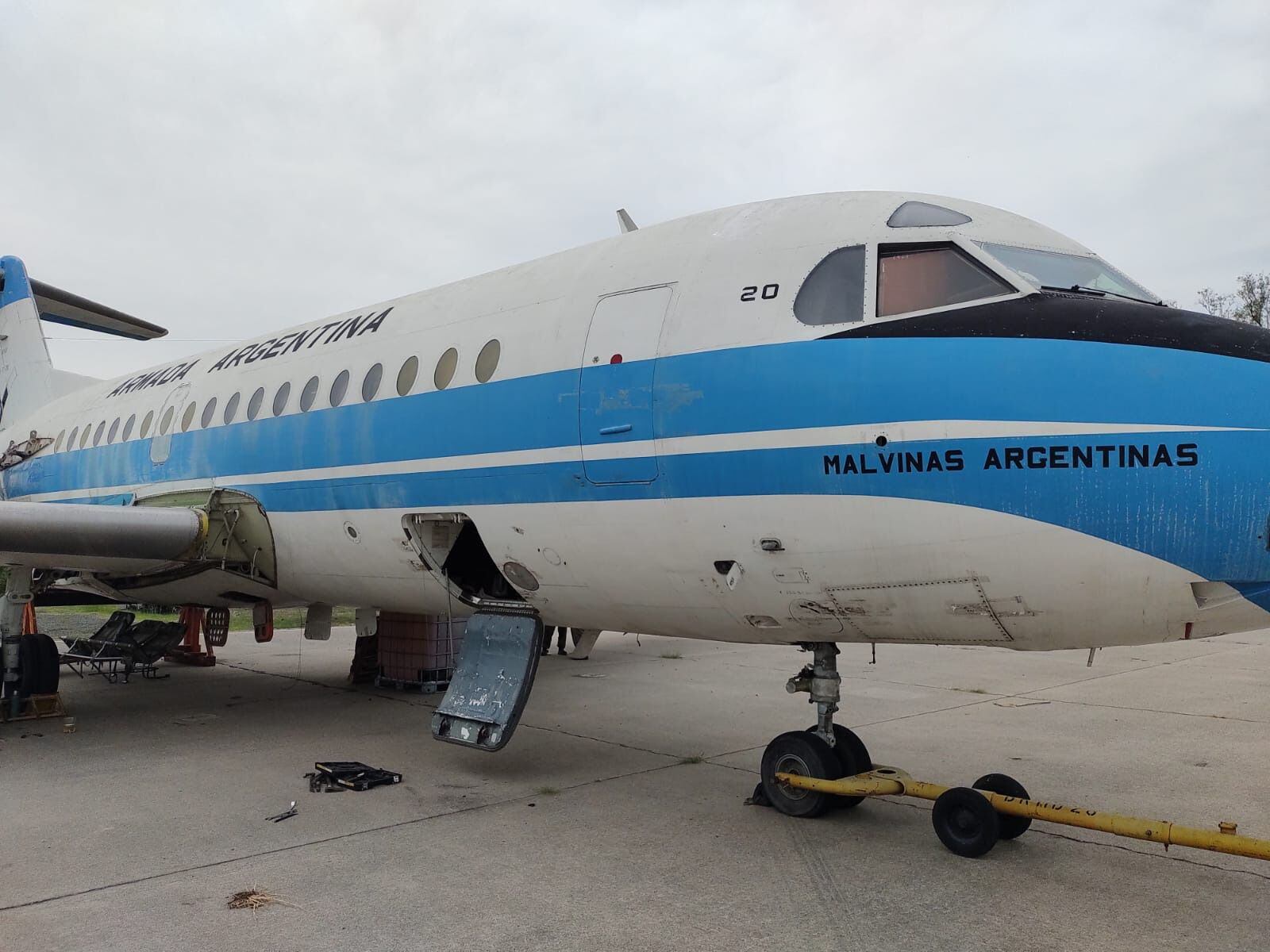 Lo habían sumido en el olvido, frente a un hangar técnico, tapado de maleza, cubierto además por un irreconocible Tango 10, casi chatarra. El Fokker F 28 MK 300 5 Tango 20 “Islas Malvinas”, fue acondicionado para cumplir funciones sanitarias y otras durante la guerra de Malvinas. Aterrizó en las islas el mismo 2 de abril y su primera misión fue regresar al continente con el cuerpo del capitán Pedro Giachino, y también con el cabo Ernesto Urbina, herido en la acción en la que falleció el único argentino en la recuperación de las islas.