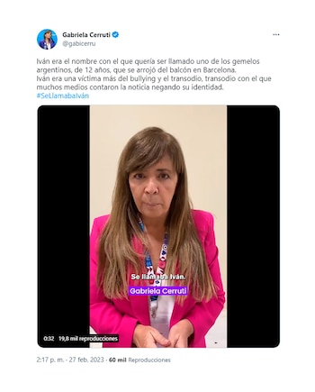 “Iván era el nombre con el que quería ser llamado uno de los gemelos argentinos, de 12 años, que se arrojó del balcón en Barcelona. Iván era una víctima más del bullying y el transodio, transodio con el que muchos medios contaron la noticia negando su identidad”, sentenció Cerruti al compartir en su cuenta de Twitter un video junto al hashtag #SeLlamabaIván.