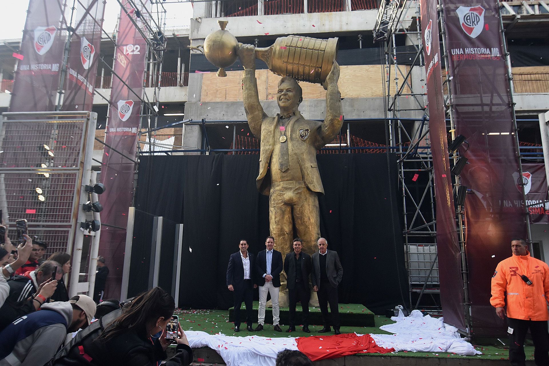 Esa particularidad fue la que sorprendió a las hinchas y al público general, cuando este sábado cayó la manta riverplatense que cubría a la estatua y dejó al descubierto la figura completa del ex entrenador.