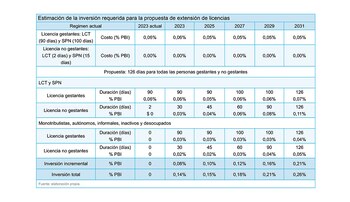 Las iniciativas locales, gremiales y empresarias son muy valiosas y marcan que el mercado también se aggiorna en acompañar la conciliación familiar y laboral. De todas maneras, el costo -si se aprueba por ley- de las licencias reformaría la Ley de Contrato de Trabajo y se haría con fondos del Estado, sin afectar el costo laboral de las empresas. Las fuentes legislativas aseguran que los beneficios son superlativas y que la inversión es baja en relación al cambio social que implica y a los beneficios futuros para el país al apoyar a las familias que quieren tener hijos e hijas.