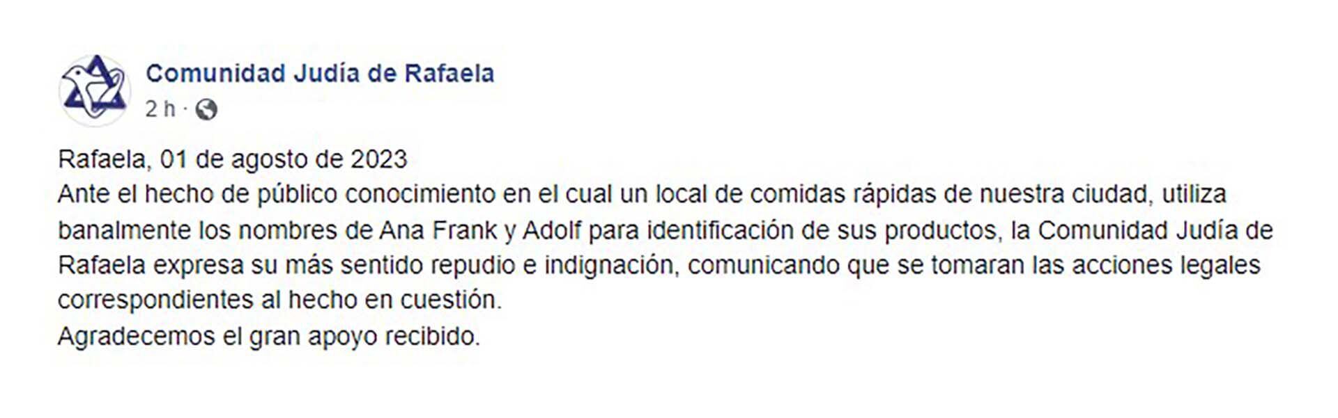 “Ante el hecho de público conocimiento en el cual un local de comidas rápidas de nuestra ciudad, utiliza banalmente los nombres de Ana Frank y Adolf para identificación de sus productos, la Comunidad Judía de Rafaela expresa su más sentido repudio e indignación, comunicando que se tomaran las acciones legales correspondientes al hecho en cuestión”, dice la publicación en Facebook, además de agradecer el apoyo recibido.