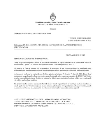 El Gobierno autorizó el uso de patentes provisorias de papel para todo tipo de vehículos debido a la escasez de las placas de chapa metálica obligatorias. Esta medida temporal se debe a problemas de suministro por parte de la Casa de la Moneda y afecta a distintas oficinas del Registro Automotor.