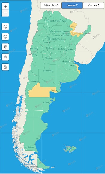 En tanto, este jueves hay alerta meteorológica amarilla por tormentas en 5 provincias: Formosa, Chaco, Buenos Aires, Corrientes y Río Negro. En Formosa, la alerta rige para la madrugada y las localidades afectadas serán Laishí, Pilagás, Pilcomayo, Pirané. En Chaco, las regiones afectadas serán Bermejo, General Donovan, Libertad, Primero de Mayo y San Fernando. En tanto, en Corrientes, la alerta rige para Ituzaingó y San Miguel durante la madrugada. Se estiman valores de precipitación acumulada entre 30 y 50 mm, pudiendo ser superados de forma puntual.