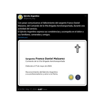 “Con pesar comunicamos el fallecimiento del sargento Franco Daniel Maizarez, del Comando de la IVta Brigada Aerotransportada, durante una actividad del servicio. El Ejército Argentino expresa sus condolencias y acompaña en el dolor a sus familiares, camaradas y amigos”, reza el breve mensaje que el Ejército Argentino compartió ayer a través de sus redes sociales.