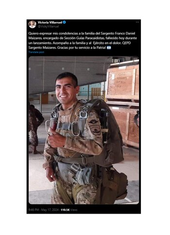 “Quiero expresar mis condolencias a la familia del Sargento Franco Daniel Maizarez, encargado de Sección Guías Paracaidistas, fallecido hoy durante un lanzamiento. Acompaño a la familia y al Ejército en el dolor. QEPD Sargento Maizarez. Gracias por tu servicio a la Patria!”, escribió Villarruel.