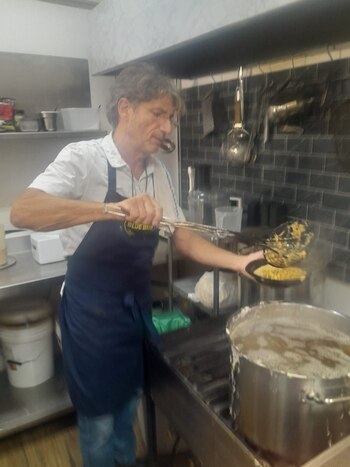 Sergio es un chef con amplia trayectoria en Israel, pero desde hace 10 años decidió especializarse sólo en hummus, un producto que comparten a los dos lados de las fronteras de Medio Oriente. Eso no es todo, el local de Helman, llamado Blue Blus, es el único que se mantiene abierto en las afueras de la ciudad de Kiriat Shmoná, la capital de la Galilea Israelí. “Decidí quedarme como una forma de dar mi aporte a la guerra. Al principio le daba de comer a los soldados que estaban apostados cerca de mi local -explica el cocinero, con el clásico tono argentino pese a llevar 4 décadas en Israel-. En estos momentos se me hace muy difícil la soledad. Encima mis hijas menores se movieron con su mamá hacia otro lugar más seguro. La madre no aguantaba las sirenas y el temor constante”.