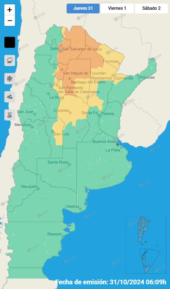 En lo que respecta a Santiago del Estero, una de las jurisdicciones con mayor presencia de calores extremos, el organismo adelantó que se espera la llegada de varias tormentas que podrían afectar a la región en las próximas horas y que podrían intensificarse durante la tarde de este jueves hasta las primeras horas de la noche. Adicionalmente, el SMN señala una temperatura máxima de 33° C, subiendo un punto el viernes. Aun así, advierte que las tormentas estarían acompañadas de granizo y concentraciones de lluvia entre 50 y 90 mm en cortos períodos de tiempo, lo que puede ocasionar anegamientos en las calles.