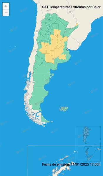 Asimismo, en otras ocho provincias, que conforman el centro del país, rige alerta amarilla por temperaturas extremas. En casi toda la superficie de La Pampa, el clima para hoy oscilará entre los 20° y los 38°, con cielo parcialmente nublado, mientras que para la tarde del miércoles se espera el pico térmico con 39°.