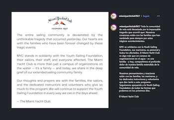 "El MYC se solidariza con la Youth Sailing Foundation, sus navegantes, su personal y todos los afectados. El Miami Yacht Club es más que un conjunto de organizaciones junto al agua: es una familia, y hoy compartimos el profundo dolor de nuestra comunidad de vela extendida. Nuestros pensamientos están con las familias, los navegantes y los dedicados instructores y voluntarios que aportan tanto a este programa. Seguiremos apoyando a la Youth Sailing Foundation en todo lo que sea posible en los próximos días", completaron.