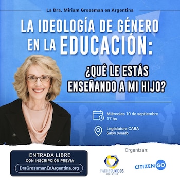 La reconocida psiquiatra estadounidense Miriam Grossman vino a la Argentina invitada por la asociación Padres Unidos (contra la ideología de género en la escuela) y por Citizen Go, que previamente le habían enviado los libros y manuales que se distribuyen en varias provincias argentinas para el dictado de Educación Sexual Integral (ESI) a fin de que los analizara. Grossman dio una conferencia en la Legislatura de la Ciudad de Buenos Aires, de la que la anfitriona fue la legisladora Marina Kienast, y presentó en la UCA la flamante edición por Hormesis de su libro en castellano. También participó de varias reuniones con autoridades y profesionales vinculados a niñez y adolescencia, en particular de un desayuno al que asistieron funcionarios nacionales, senadores y diputados de diferentes sectores políticos, psicólogos, docentes, integrantes de la Sociedad Argentina de Pediatría e investigadores.