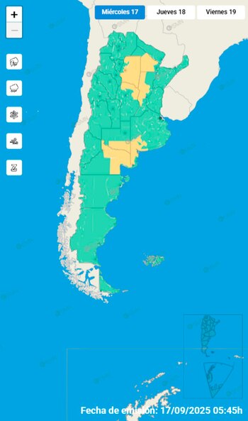 Para hoy, el SMN indicó que rige una alerta amarilla por tormentas en Chaco, Santiago del Estero, Santa Fe, Córdoba, Provincia de Buenos Aires, La Pampa y Río Negro. En estos casos se recomienda no sacar la basura y retirar los objetos que impidan que escurra, evitar las actividades al aire libre, no refugiarse cerca de árboles y postes de electricidad ni permanecer en playas, ríos, lagunas o piletas.