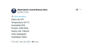 El sábado se perfila como la jornada de mayor inestabilidad. En la capital, la probabilidad de lluvias se incrementará durante la mañana, con algunas ráfagas de viento de hasta 50 km/h, que incrementarán tormentas aisladas que se mantendrán hasta la noche, ya bajo el rango de lluvias más pronunciadas. Con respecto a la temperatura, por la tarde-noche del sábado comenzará a descender la temperatura con una franja entre los 18 y 22 grados.