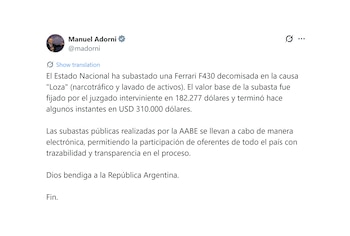 La operación fue comentada a través de redes sociales por el jefe de Gabinete, Manuel Adorni, quien celebró la realización del remate: “El Estado Nacional ha subastado una Ferrari F430 decomisada en la causa ‘Loza’ (narcotráfico y lavado de activos). El valor base de la subasta fue fijado por el juzgado interviniente en 182.277 dólares y terminó hace algunos instantes en USD 310.000 dólares”, expresó el funcionario en su cuenta oficial. Adorni añadió que las subastas públicas organizadas por la AABE se realizan de manera electrónica, permitiendo la participación de oferentes de todo el país con trazabilidad y transparencia.