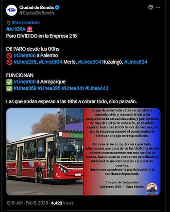 Con un comunicado, el cuerpo de delegados de los trabajadores de la Empresa 216 advirtieron que podrían extender la paralización a todas sus líneas si antes de las 18 horas no se acredita la totalidad de los salarios. Actualmente, solo cuatro de las nueve líneas de la compañía mantienen la medida de fuerza.