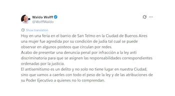 “Repudiamos con absoluta firmeza el ataque antisemita ocurrido en la Feria de San Telmo, donde una artesana fue hostigada por el solo hecho de ser judía. El antisemitismo es inadmisible. Es una forma de odio que constituye un delito y no lo vamos a dejar pasar bajo ningún concepto”, señaló un comunicado de la Ciudad de Buenos Aires y que fue replicado por el jefe de gobierno porteño, Jorge Macri.