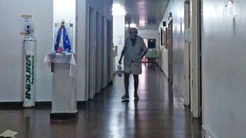 En uno de los pasillos del sector de internación aceptó una breve charla con Infobae. Anda encorvado y lento sobre unas zapatillas verdes sin medias, bermudas marrones y camisa de mangas cortas con una remera debajo en la que se lee en inglés una palabra con múltiples acepciones: "light" puede ser luz, claro, o liviano.