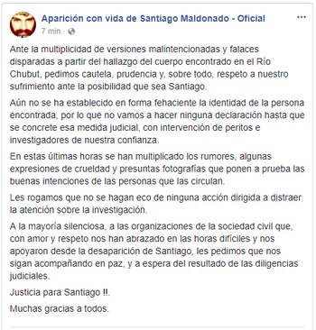 Ante la multiplicidad de versiones malintencionadas y falaces disparadas a partir del hallazgo del cuerpo encontrado en el Río Chubut, pedimos cautela, prudencia y, sobre todo, respeto a nuestro sufrimiento ante la posibilidad que sea Santiago.