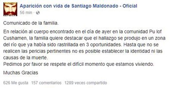 A través de un comunicado, la fiscalía de Esquel indicó que el cadáver fue encontrado "a 300 metros río arriba desde el epicentro del conflicto que se desarrolló el día 1° de agosto de 2017". Fuentes de la fiscalía dijeron a Infobae que se trata de "un sujeto masculino que por el tamaño y la vestimenta podría ser la persona que estamos buscando" y agregaron que "hay que esperar para aseverar su identidad".