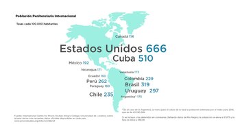 3. Pese al fuerte crecimiento de la población carcelaria, Argentina tiene una de las tasas de detención más bajas de la región: 175 cada 100 mil habitantes. Solo Ecuador y Venezuela tienen menos personas privadas de la libertad. Lidera el ranking Estados Unidos, con 666 presos cada 100 mil habitantes, seguido por Cuba (510), Brasil (319) y Uruguay (297).