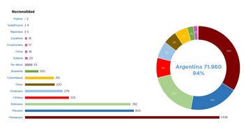 6. El 94% de los detenidos son de nacionalidad argentina. En segundo lugar se encuentran los paraguayos, con 1.438 presos. El escalafón lo completan peruanos, bolivianos, chilenos y uruguayos. No hay ningún estadounidense detenido en la Argentina, sí dos ingleses.