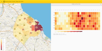 A partir de las opciones que seleccionemos el mapa cruzará los números que hayan sido cargados (a partir de las denuncias en comisarías y encuestas de victimización) y devolverá en principio un "mapa de calor" que irá desde distintos tonos de rojo hacia los naranjas claros, para diferenciar el grado de presencia de un delito en un determinado barrio/comuna, según se haya seleccionado. Si además tildamos la opción "Grilla por día y hora", esta se desplegará a la derecha de la pantalla mostrándonos en una tabla cómo varía la intensidad a lo largo de cada franja horaria.