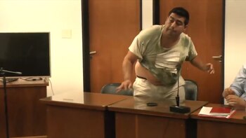 El episodio se produjo ayer en los tribunales de Viedma y quedó registrado en un video, en el que se ve como el acusado de 26 años y de apellido Belmar arrojó un vaso de vidrio que estalló contra el escritorio en el que estaba sentado el fiscal y que le provocó heridas leves al magistrado y a un periodista que cubría la audiencia.