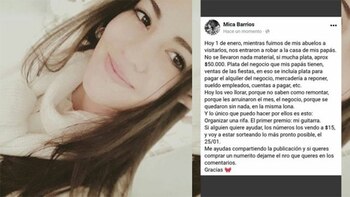 "Hoy 1 de enero, mientras fuimos de mis abuelos a visitarlos, nos entraron a robar a la casa de mis papás, aproximadamente $50.000. Plata del negocio que mis papás tienen, ventas de las fiestas, en eso se incluía plata para pagar el alquiler del negocio, mercadería a reponer, sueldo empleados, cuentas a pagar, etcétera", escribió la joven en su cuenta de Facebook.