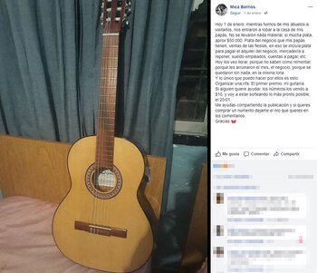 Luego del lamentable episodio, Micaela, la hija del matrimonio Barrios, decidió lanzar una campaña en redes sociales para ayudarlos. "Mis papás son laburantes, no merecen que les arruinen la vida de esta forma", escribió la adolescente, al tiempo que ofreció su guitarra como primer premio de una rifa solidaria.