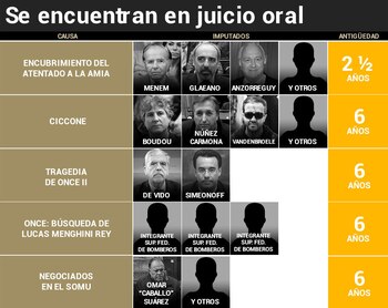 En Casación están la causa por la tragedia de Once en la que murieron 51 personas, dos expedientes en los que está condenado el ex Presidente Carlos Menem: el contrabando de armas a Ecuador y Croacia y otra por el pago de sobresueldos durante su gobierno; y la investigación por el cotillón que compró Guillermo Moreno en su campaña anti Clarín financiada con recursos públicos.