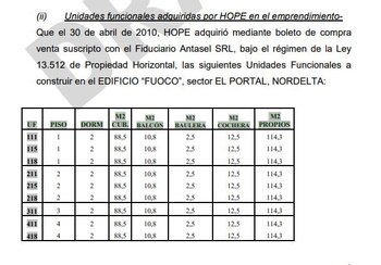 Infobae accedió al modelo de contrato, un documento de 14 carillas que los vendedores de Hope Funds entregaban a los compradores. Las dudas de Servini se evacúan en el documento: 15 y no 14 unidades funcionales son mencionadas como adquiridas por la empresa en el edificio "Fuoco", cada una de 114 metros cuadrados en total, 88,5 de ellos cubiertos con cochera y balcón incluidos. El precio de venta era de 27.500 dólares por cada CIP que equivalía a 16 metros cuadrados, con cada metro tasado en 1700 dólares, inversión que devendría en "un rendimiento o plusvalía" luego de un cálculo de "utilidad de inversión."