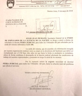 A raíz del "apagón informático", el titular de la Unión de Empleados de la Justicia de la Nación, Julio Piumato, le solicitó a la Corte Suprema que decrete feria judicial para todos los tribunales del país afectados por la caída del sistema Lex-100.