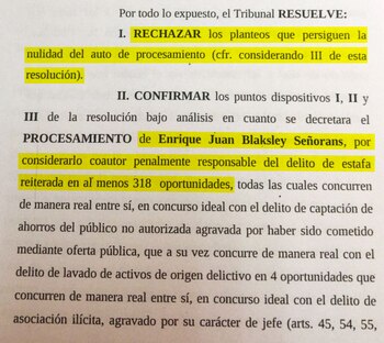 El 26 de abril pasado y a través de una resolución de 337 páginas, la jueza María Romilda Servini procesó a Enrique Juan Blaksley Señoranss, presidente y principal socio de la financiera Hope Funds, por 318 hechos de estafa y cuatro de lavado. Este lunes la Cámara Federal con el voto de los jueces Martín Iruzun y Leopoldo Bruglia, confirmó el procesamiento del empresario, que deberá cumplir prisión preventiva y sobre el que recae un embargo por 3 mil millones de pesos.