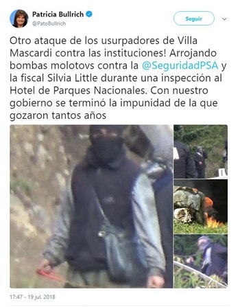 La ministra Bullrich, por su parte, salió a hablar del tema a través de su cuenta de Twitter: "Otro ataque de los usurpadores de Villa Mascardi contra las instituciones. Arrojando bombas molotovs contra la @SeguridadPSA y la fiscal Silvia Little durante una inspección al Hotel de Parques Nacionales. Con nuestro gobierno se terminó la impunidad de la que gozaron tantos años".